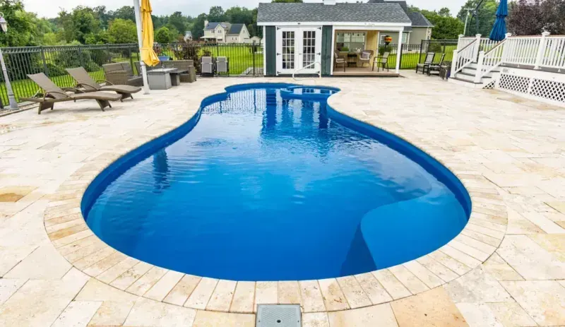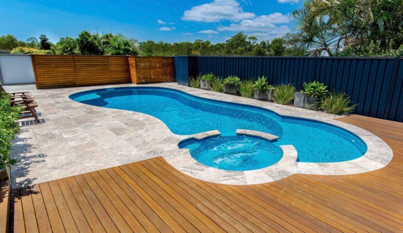 One of our most popular inground fiberglass pools with its stylish curves and full features including a splash pad, built-in spa and generous swimming area. This swimming pool design also allows for creative backyard landscaping.